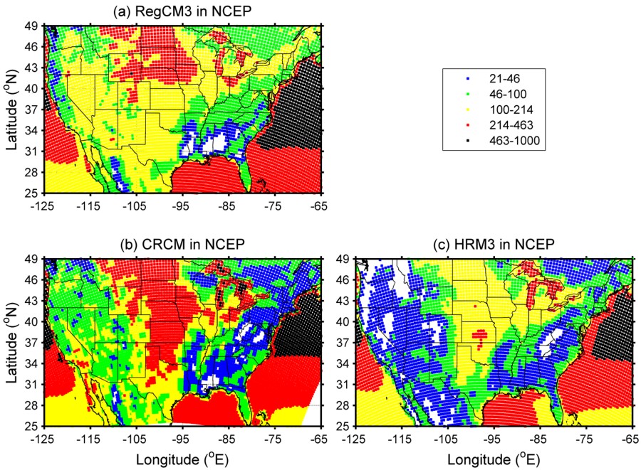 within observed lateral boundary conditions (as specified by the NCEP-DoE reanalysis dataset). Grid cells that are shown in white have an energy density below