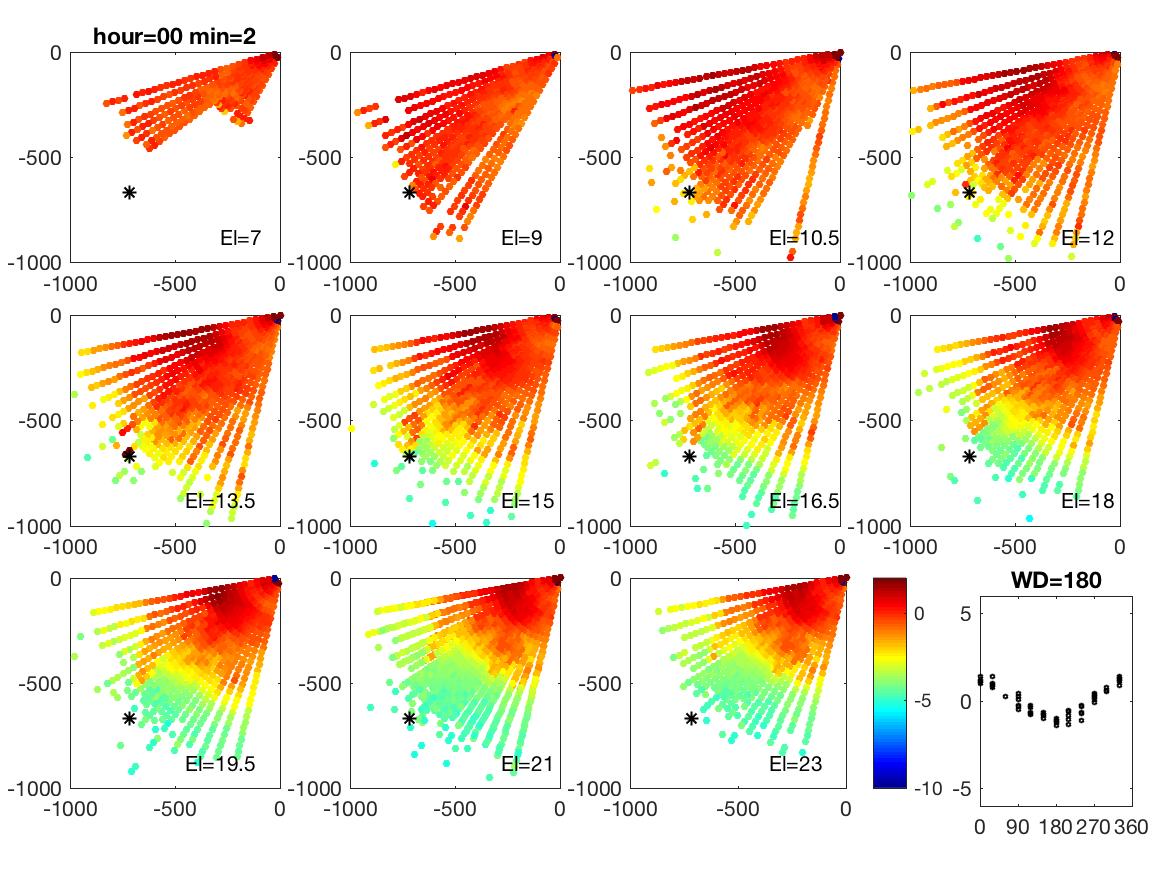 A sample of a wind turbine wake from 4th May.. the panels show the individual elevation angles, the black * is the WT and the colors denote the radial velocities.